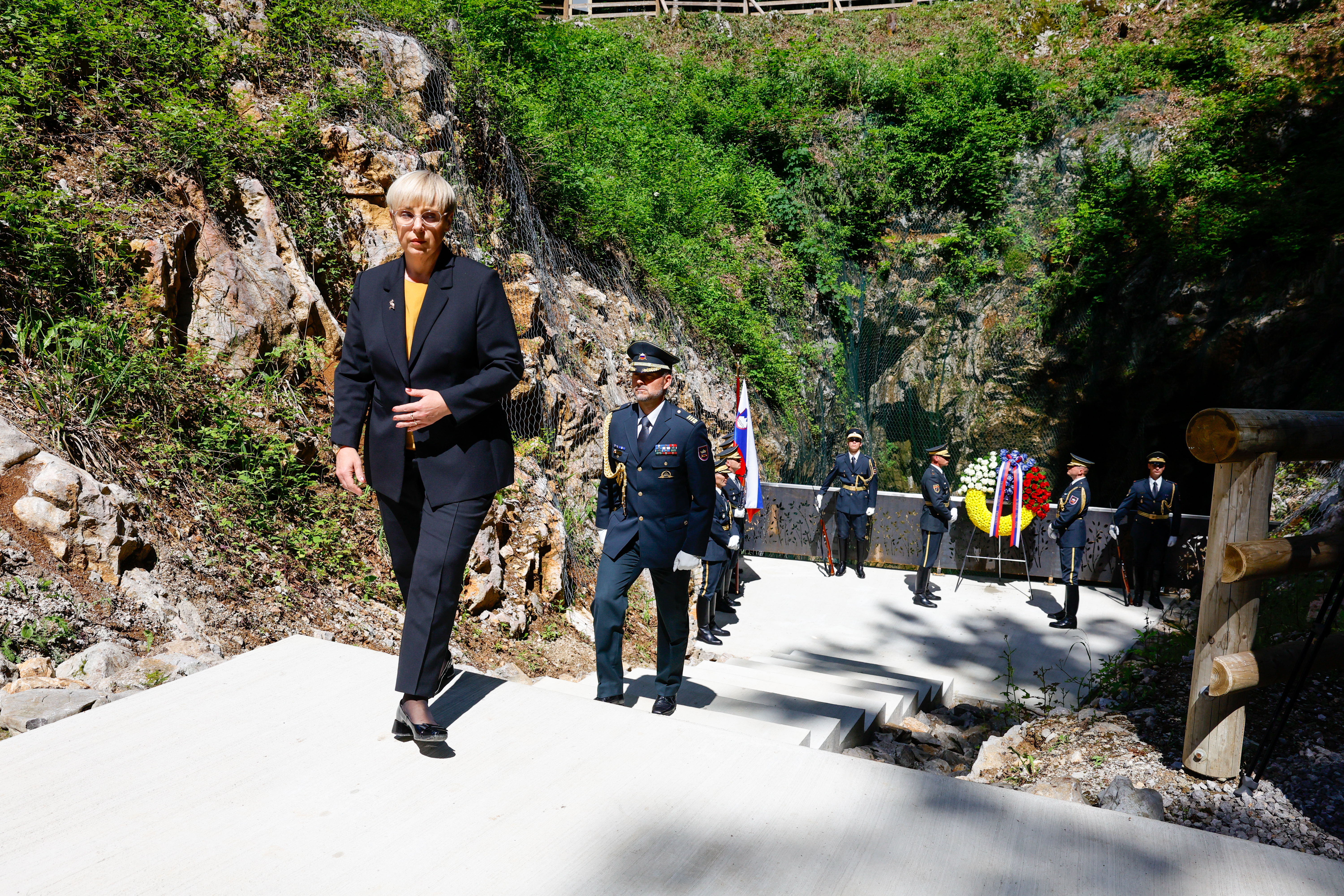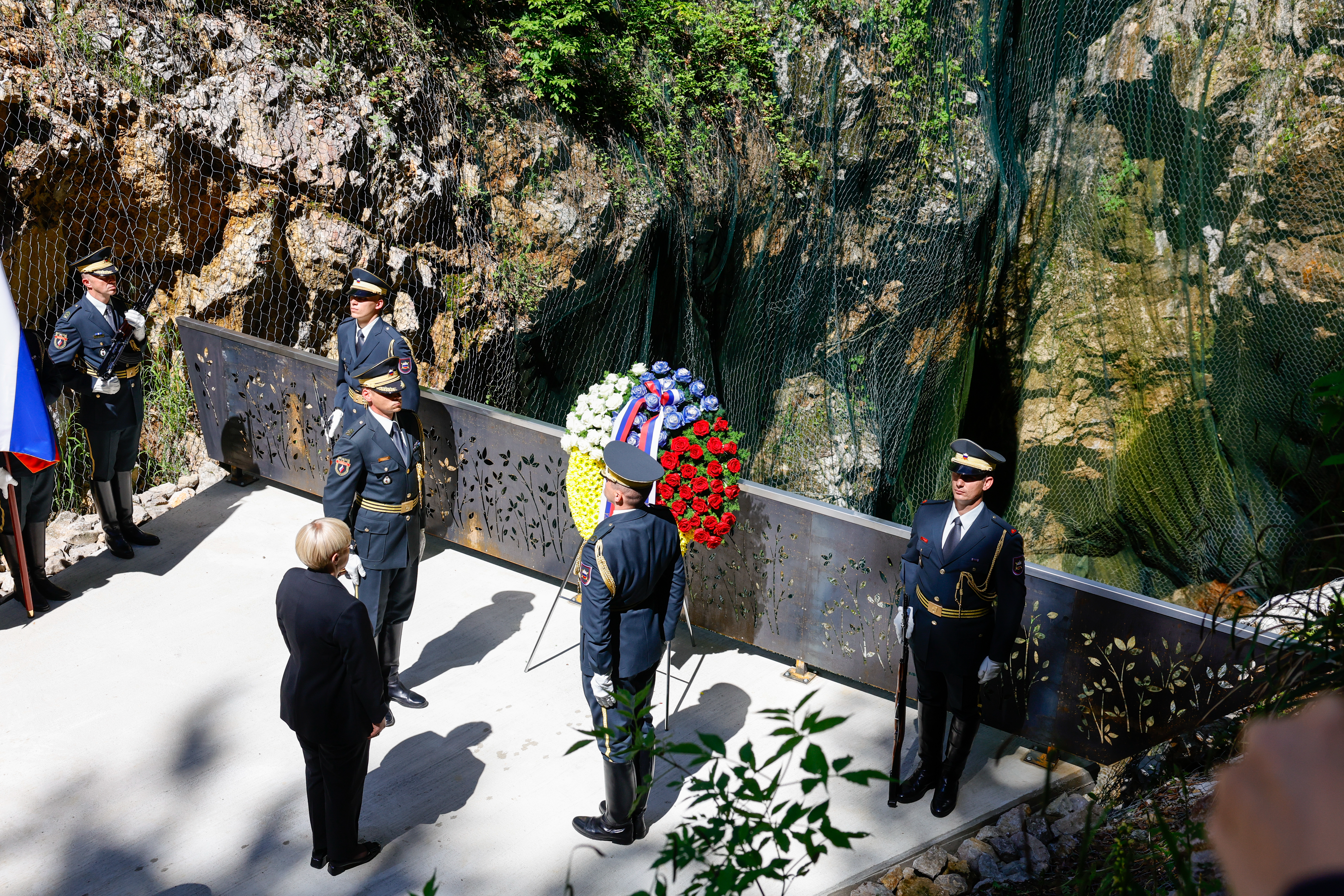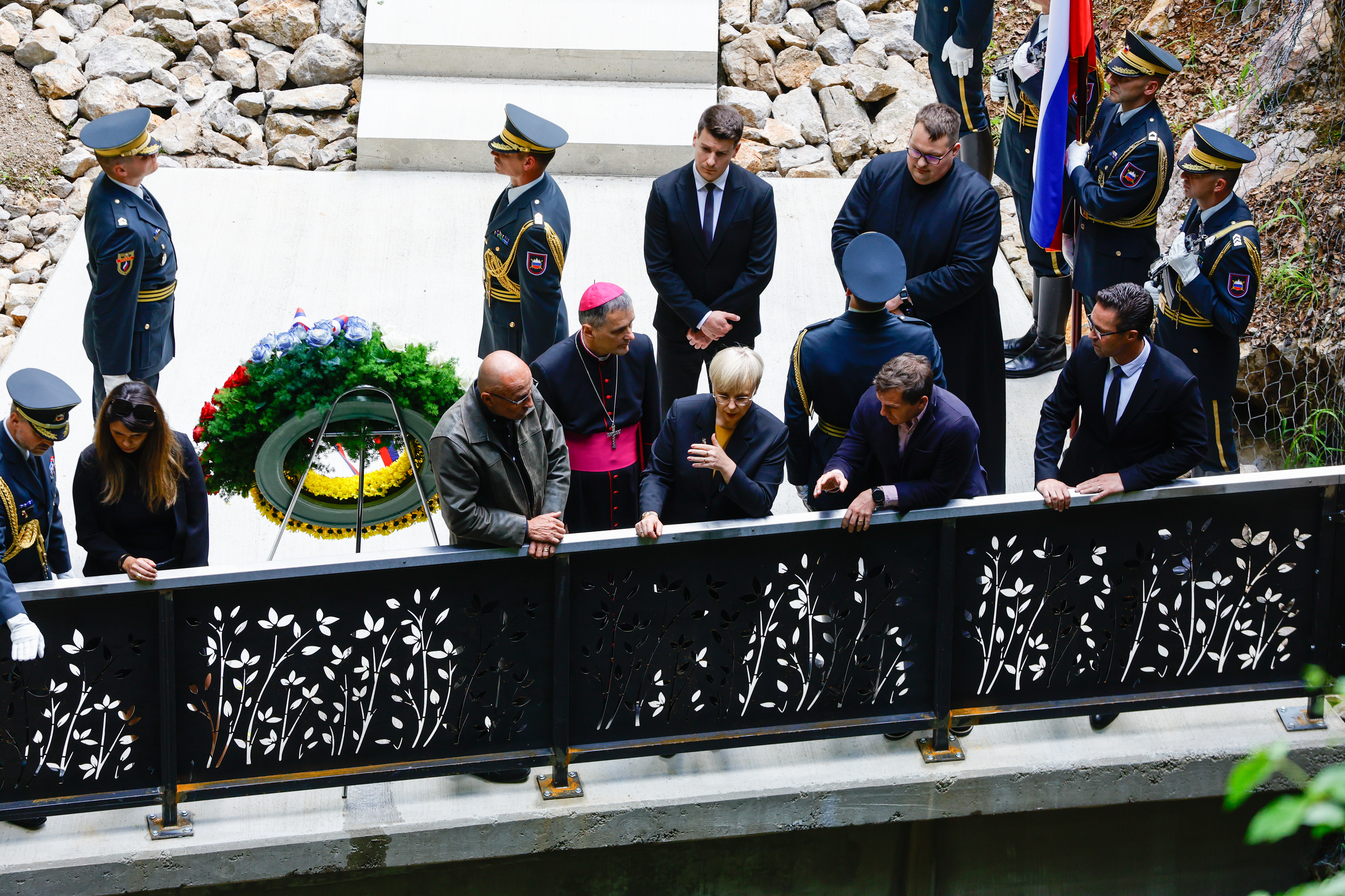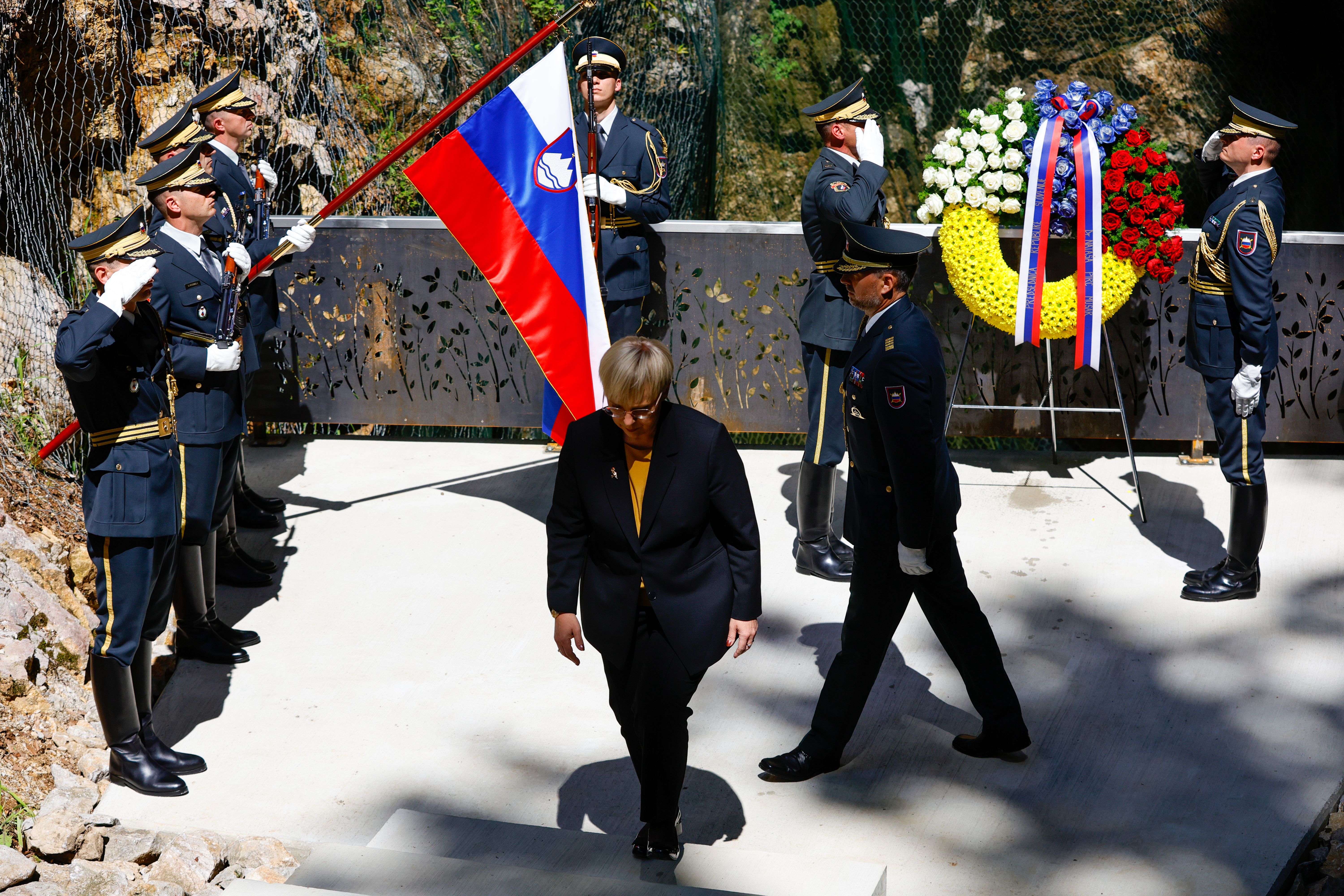 Predsednica republike Nataša Pirc Musar se je na državni slovesnosti ob Jami pod Macesnovo gorico v Kočevskem rogu poklonila žrtvam pobitih ob koncu druge svetovne vojne.