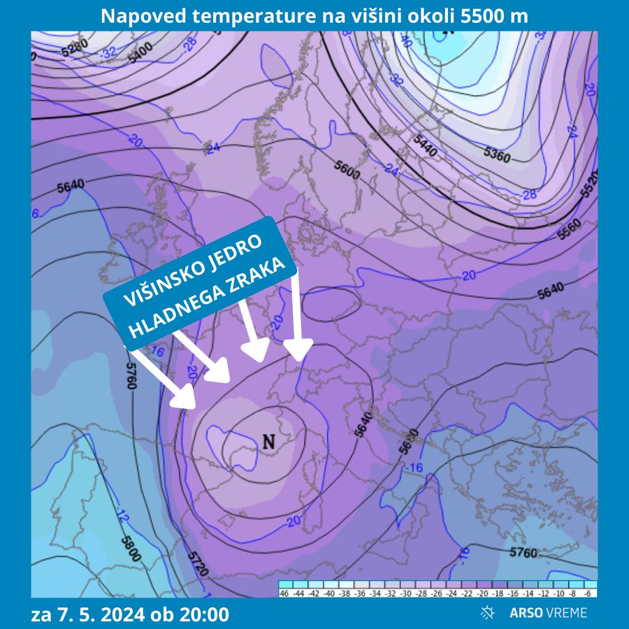 "Danes in jutri bomo pod vplivom višinskega jedra hladnega zraka, ki se bo ugrezal v Sredozemlje. Večinoma bo hladno z občasnim dežjem," so napovedali v objavi. S priložene fotografije je razvidno, da je nad južnim delom Francije na okoli 5.000 metrih nadmorske višine približno minus 34 stopinj Celzija, na isti višini nad Slovenijo pa okoli minus 20 stopinj.