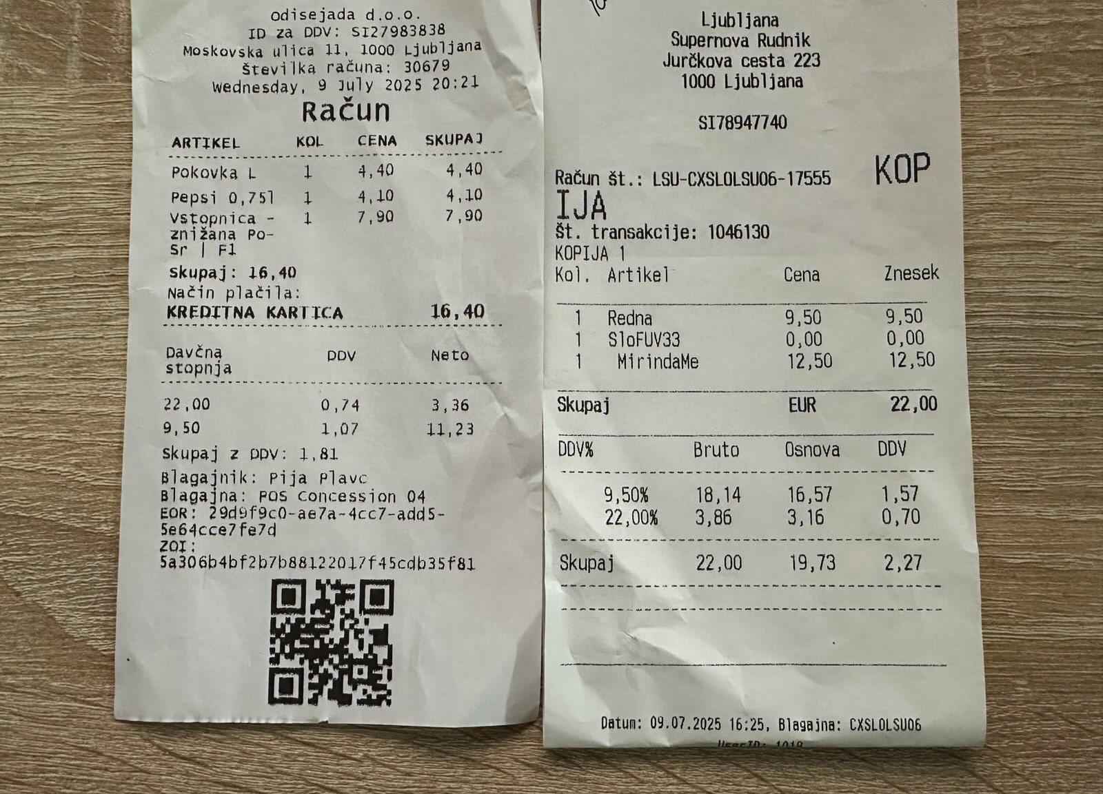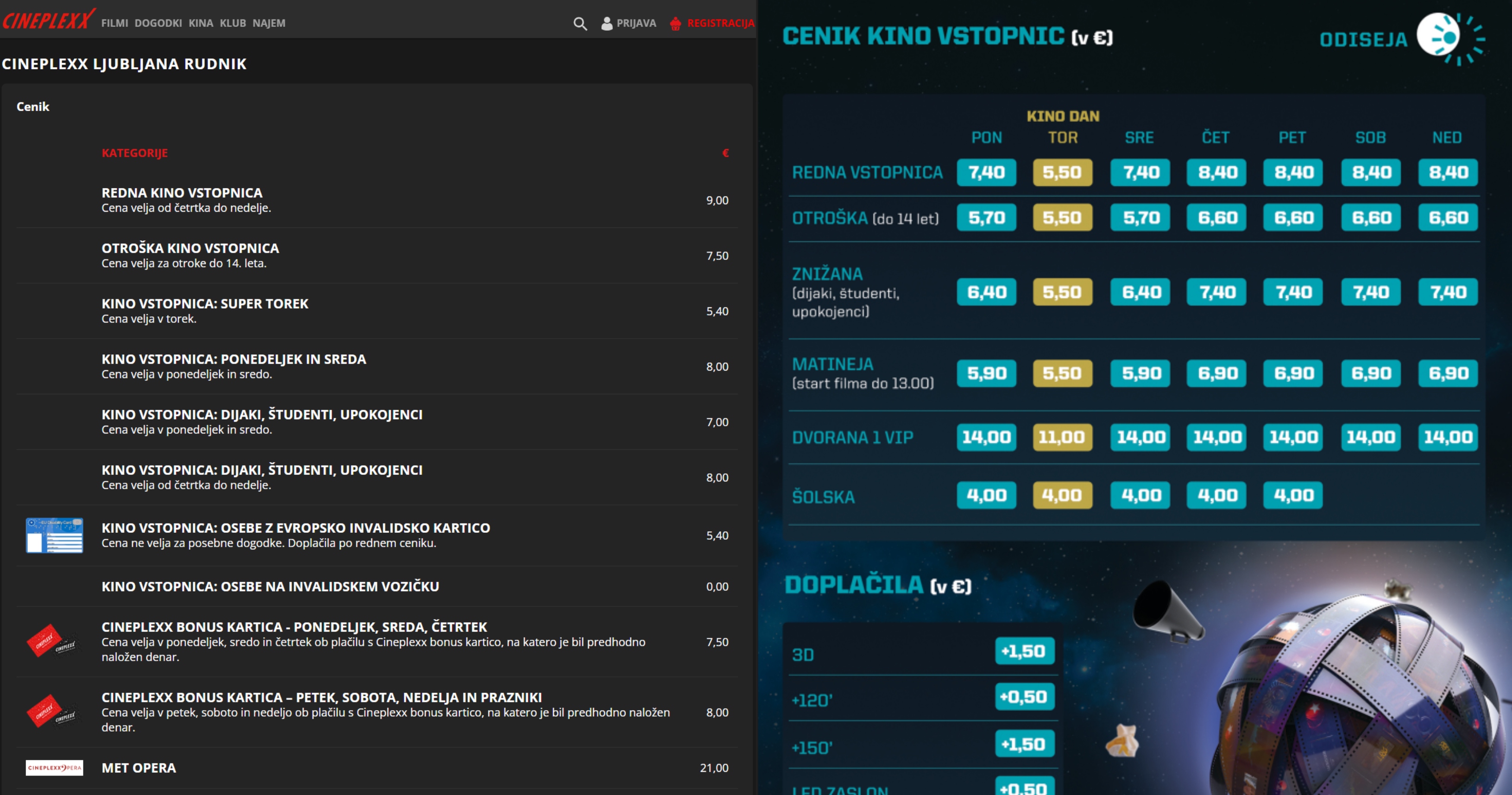Na spletni strani je navedeno, da so cene kinovstopnic ob ponedeljkih in sredah (Cineplexx smo obiskali v sredo, op. a.) cenejše in znašajo 8 evrov z doplačilom 0,50 evra za filme, daljše od 120 minut. Glede na račun, ki smo ga prejeli, so nam na blagajni zaračunali ceno redne vstopnice za 9 evrov, ki naj bi bila sicer v veljavi od četrtka do nedelje.