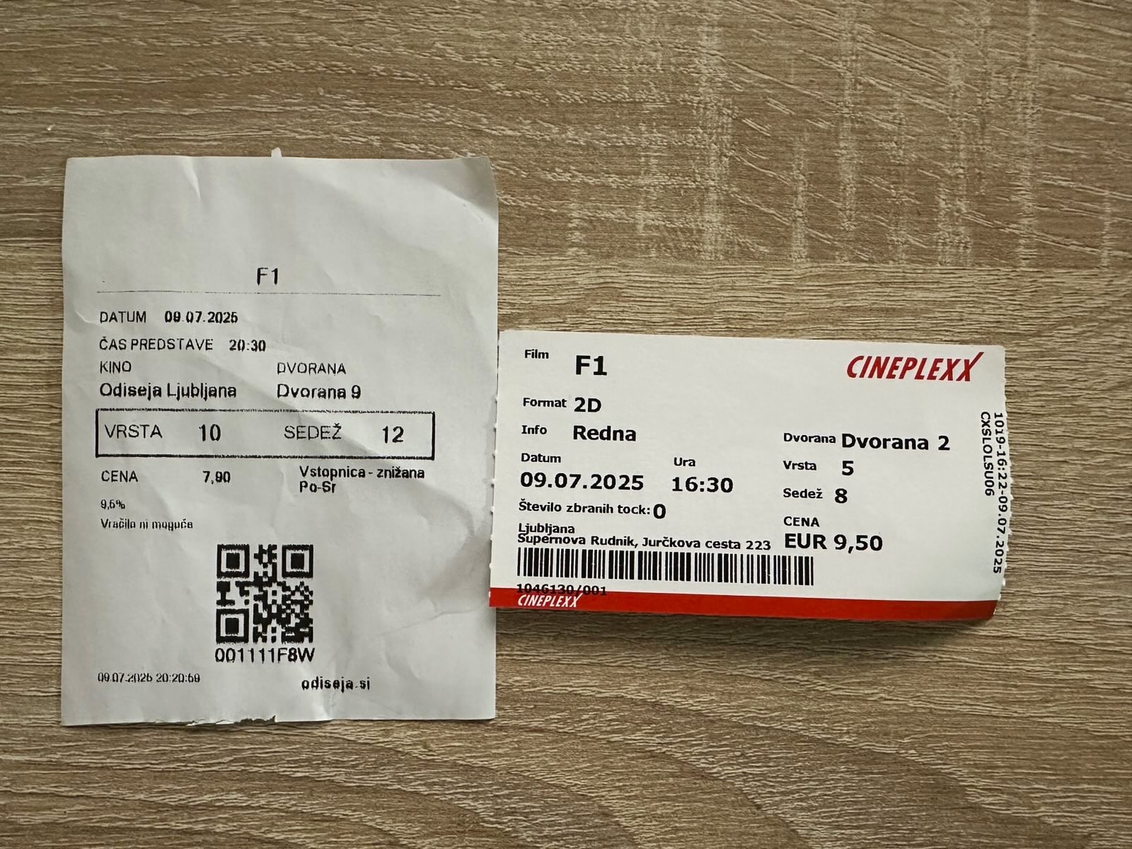Čeprav smo pričakovali, da bomo za vstopnico, glede na cenik na spletni strani, odšteli 8,50 evra, smo za ogled filma F1 v 2D, ki traja 2 uri in 35 minut, plačali 9,50 evra.