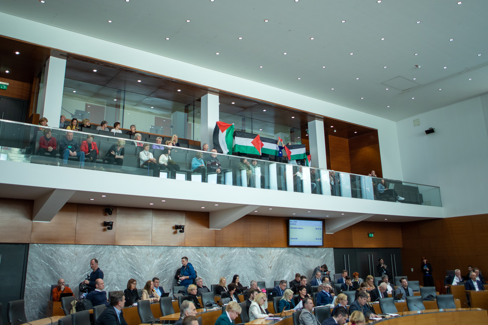 Današnji protest na balkonu DZ so organizirali v Gibanju za pravice Palestincev. Z izobešenimi palestinskimi zastavami so želeli opozoriti, da je treba Palestino postaviti na dnevni red, so zapisali. Znova so pozvali, naj se Slovenija pridruži tožbi Južne Afrike pred Meddržavnim sodiščem, naj uradno razglasi vojaški embargo na trgovanje z orožjem in vojaško opremo z Izraelom, naj predlaga in se zavzame za sankcije na ravni EU ter naj prekine diplomatske stike z Izraelom ter od tam odpokliče slovenske predstavnike.