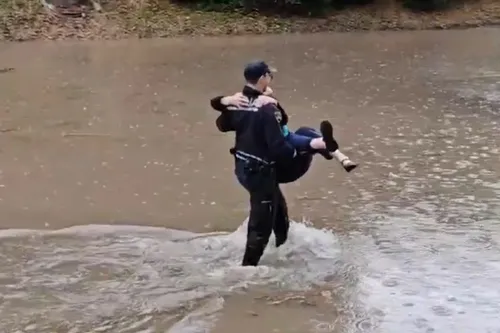 Medtem ko je voznik do pločnika odšel sam, je sopotnico na varno odnesel policist.