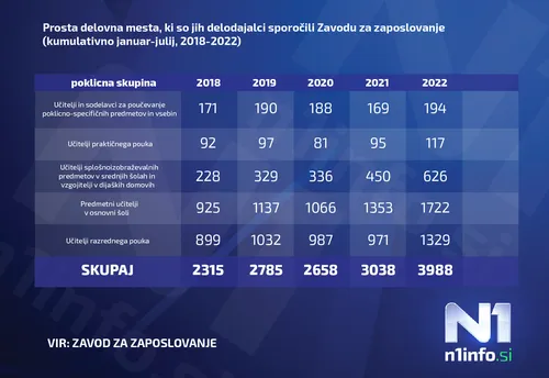 Na spletnih straneh Zavoda za zaposlovanje je trenutno objavljenih 535 prostih delovnih mest s področja izobraževanje in šport, ki poleg učiteljev zajema še vodstvene delavce in druge strokovnjake v izobraževanju, vzgojitelje in pomočnike vzgojiteljev predšolskih otrok ter športne trenerje. Podatki letošnjega leta v primerjavi s preteklimi kažejo, da se primanjkljaj povečuje. (Številke v tabeli sicer ne pomenijo, da je bilo tudi toliko prostih delovnih mest, saj gre za kumulativo (seštevek) mesecev od januarja do julija. Če so na šoli učitelja denimo iskali januarja, ga niso dobili in so februarja ponovili razpis, je delovno mesto šteto dvakrat. So pa primerljivi podatki med leti.)