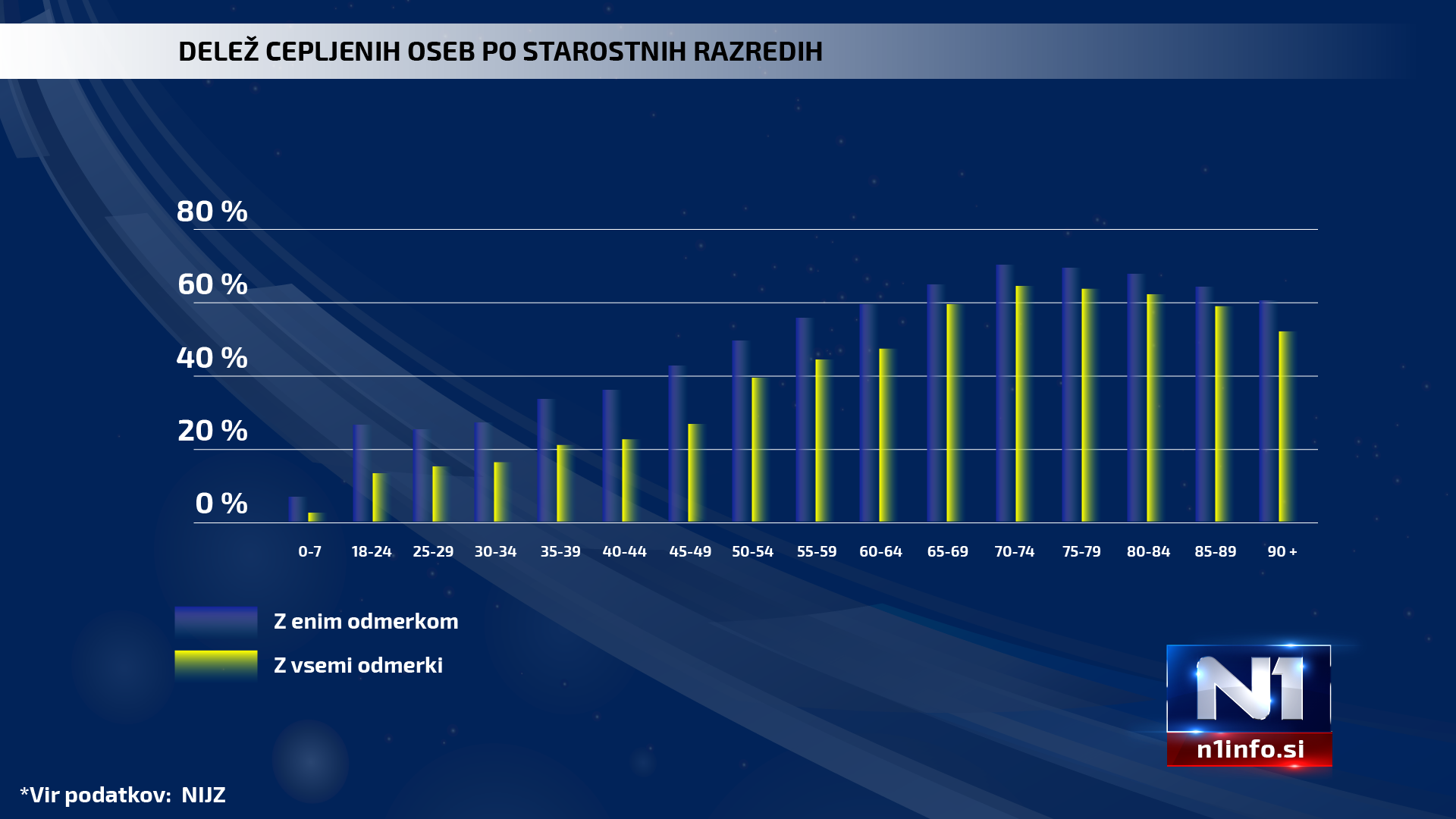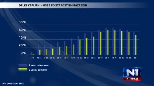 Med starejšimi od 90 let, teh je v Sloveniji okrog 18.000, je zgolj 61 odstotkov cepljenih z vsaj enim odmerkom, z obema pa le polovica. Med prebivalci, ki so starejši od 80 let, sta v Sloveniji cepljeni dve tretjini.