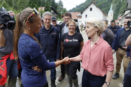 Legendarna smučarka Tina Maze se je v domači Črni na Koroškem, ki so jo poplave hudo prizadele, srečala s predsednico Evropske komisije Ursulo von der Leyen in slovenskim premierjem Robertom Golobom.