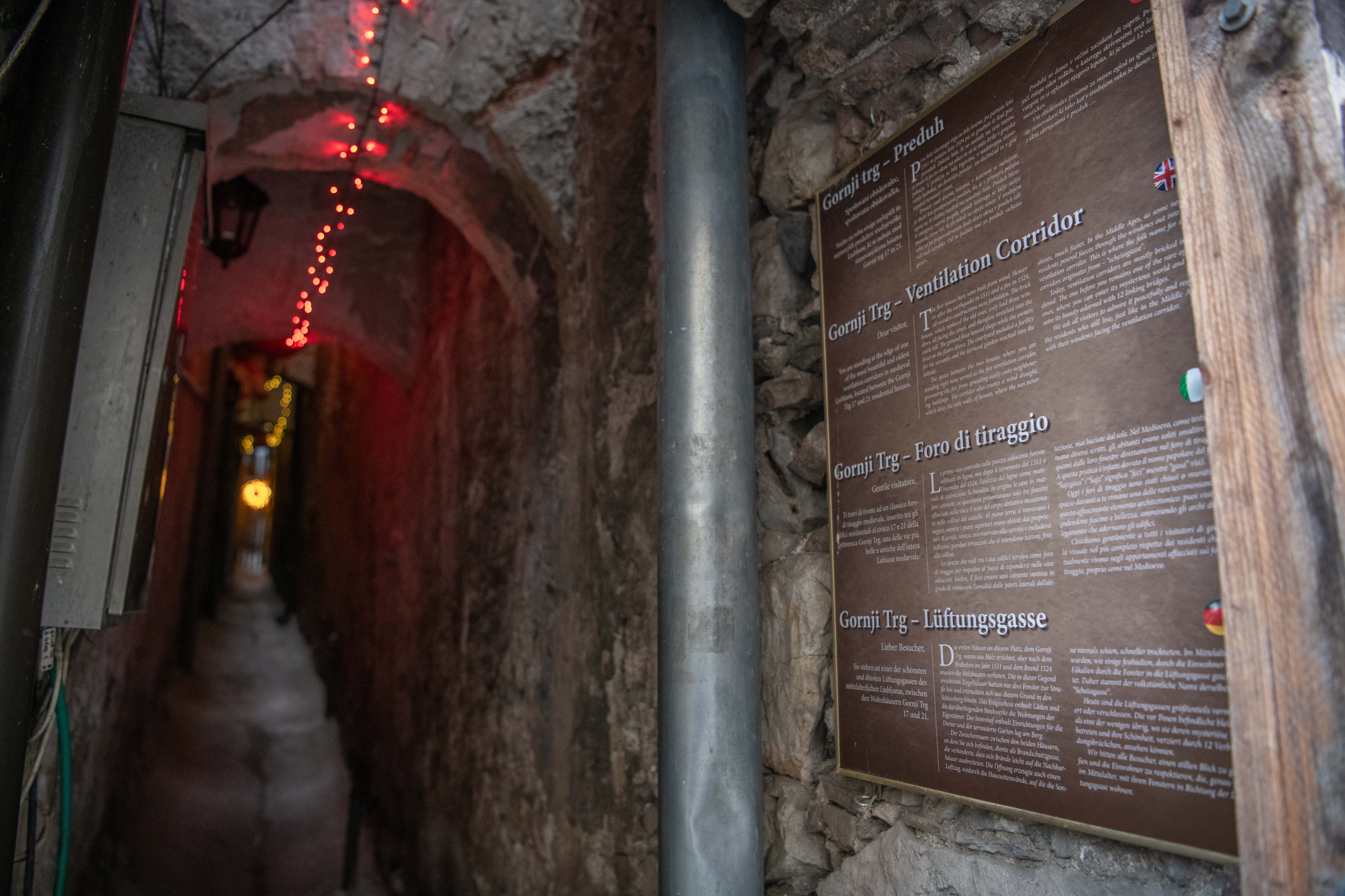 Med hišama na Gornjem trgu v Ljubljani je majhna špranja, široka komaj za enega človeka. Če se odpravite skoznjo, naletite na predor, ki je okrašen z lučkami in se po nekaj metrih nepričakovano konča. Tunelček je tam že od srednjega veka, imel pa je prav poseben namen – ali dva.