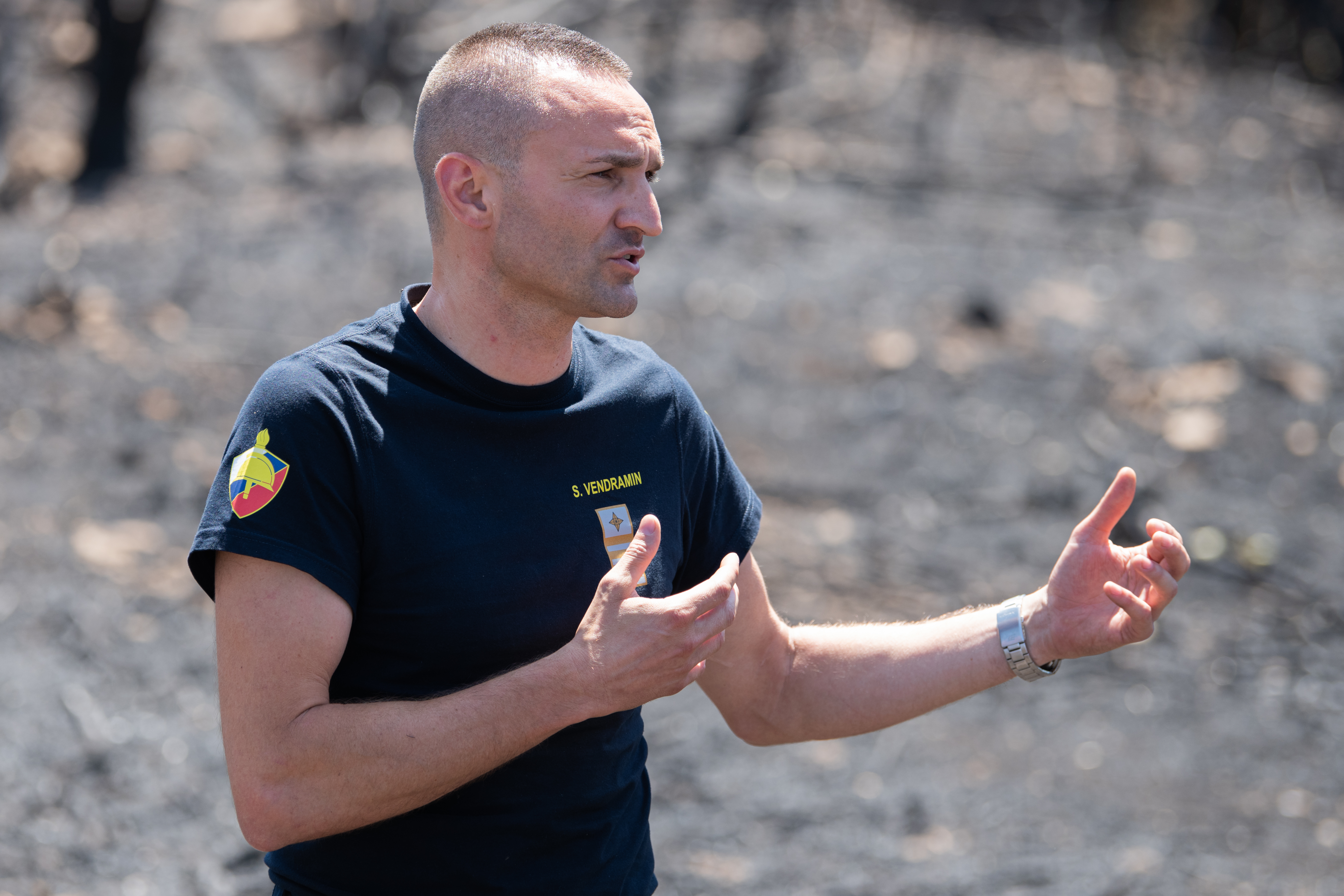Simon Vendramin je dolgoletni gasilec in poveljnik poklicne gasilske enote Nova Gorica, je tudi član tamkajšnjega prostovoljnega gasilskega društva in prejemnik zlatega znaka Civilne zaščite RS. Tokrat pa se je spopadel z najtežjim izzivom v svoji karieri – je namreč vodja intervencije ob največjem požaru v zgodovini Slovenije. Čeprav je na terenu, v mestoma nečloveških razmerah, že 13. dan zapored, skorajda ne kaže znakov utrujenosti. "Zdaj nas čaka še pisanje gore poročil," se malce kislo nasmehne ob tem, ko se srečava v zoglenelem gozdu ob glavni cesti na Krasu. Slovenijo je ravno takrat prehajala hladna fronta, ki je po dolgem času prinesla nekaj malega padavin.