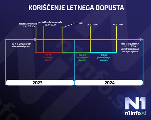 Mama, ki porodniško začne 1. avgusta, lahko na primer do takrat porabi ves letni dopust za to leto in preostanek leta koristi materinski in starševski dopust. Ko se bo prihodnje leto vrnila v službo, bo dobila dopust za tisto koledarsko leto.