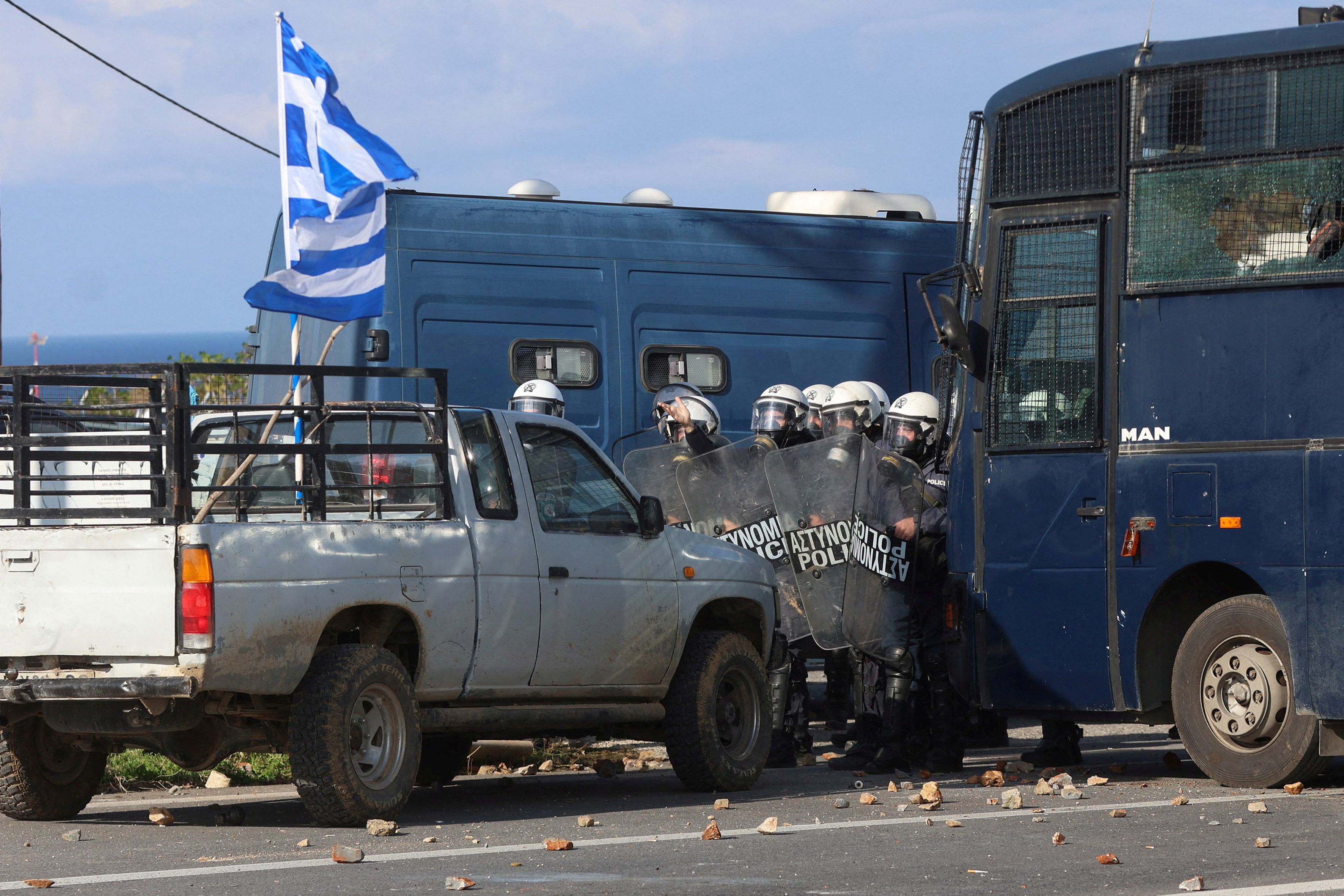 Na desetine kmetov se je glede na posnetke grške televizije TV ERT s kamenjem in palicami lotilo vozil, s katerimi je policija blokirala dostop do mednarodnega letališča Chania na otoku Kreta. Policija je na protestnike izstrelila solzivec, po njenem umiku so kmetje prevrnili eno od vozil, poroča francoska tiskovna agencija AFP.