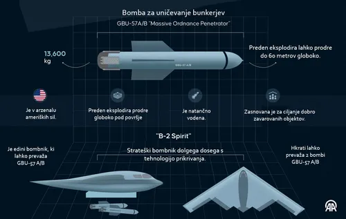 Bomba GBU-57, zasnovana za prodiranje v utrjene bunkerje, zlasti tiste, ki so globoko pod zemljo, je med najtežjimi in najmočnejšimi nejedrskimi bombami v ameriškem arzenalu, piše Business Insider.