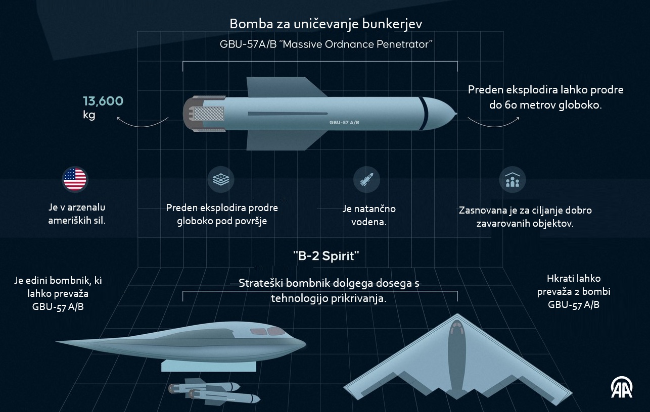 Ameriška vojska je v napadu na iranske jedrske objekte prvič uporabila skoraj 14-tonske bombe za uničevanje bunkerjev. Kaj so GBU-57 in kako delujejo?