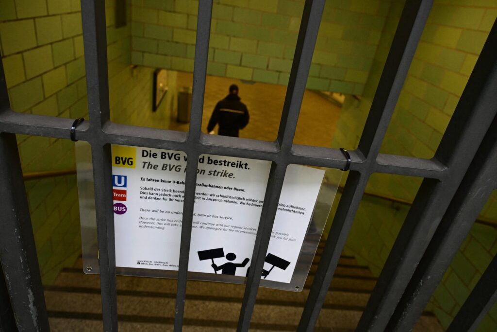 Vhodi na postaje podzemne železnice v Berlinu so bili zaklenjeni, pred njimi pa so se zbirali stavkajoči delavci s sindikalnimi zastavami.