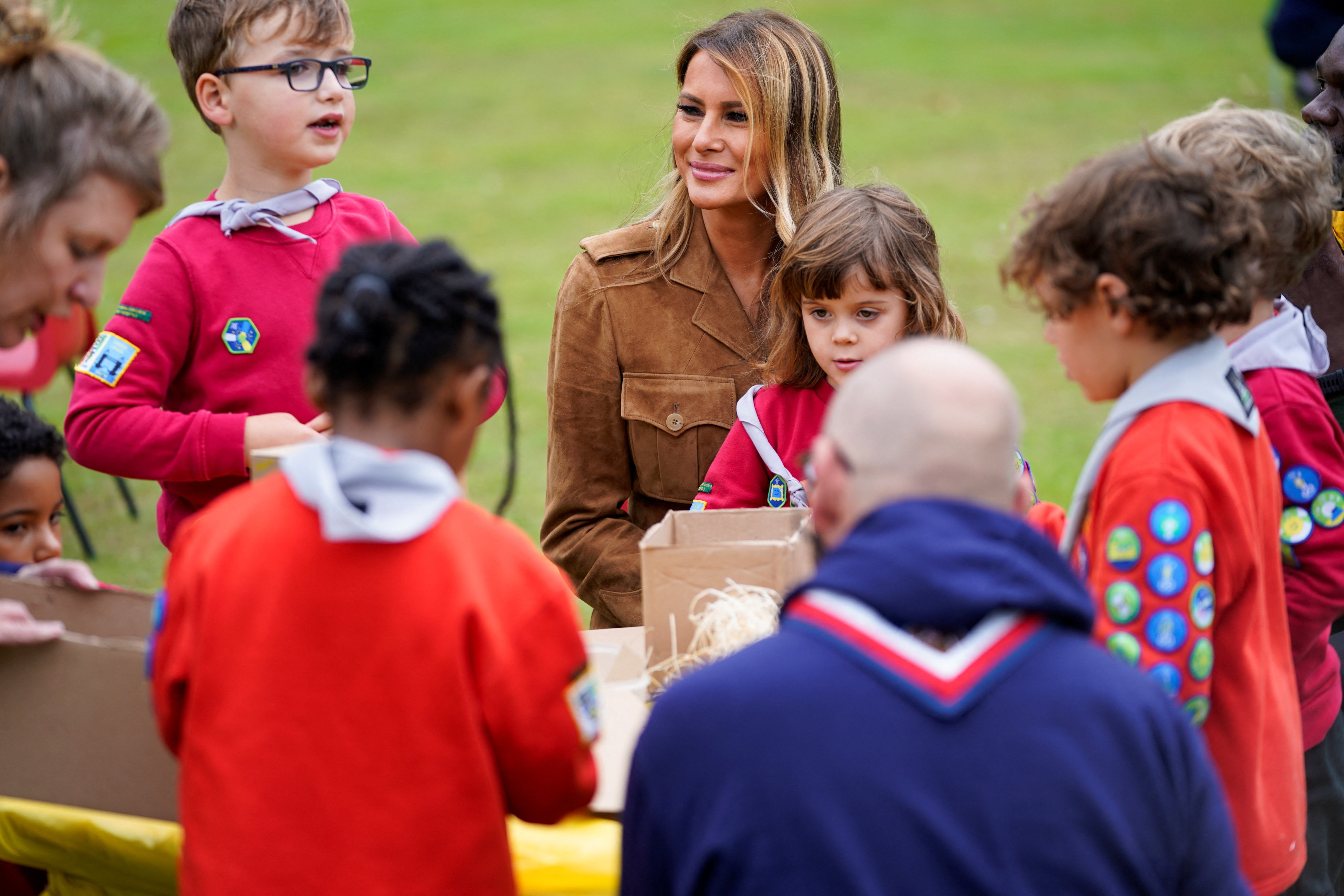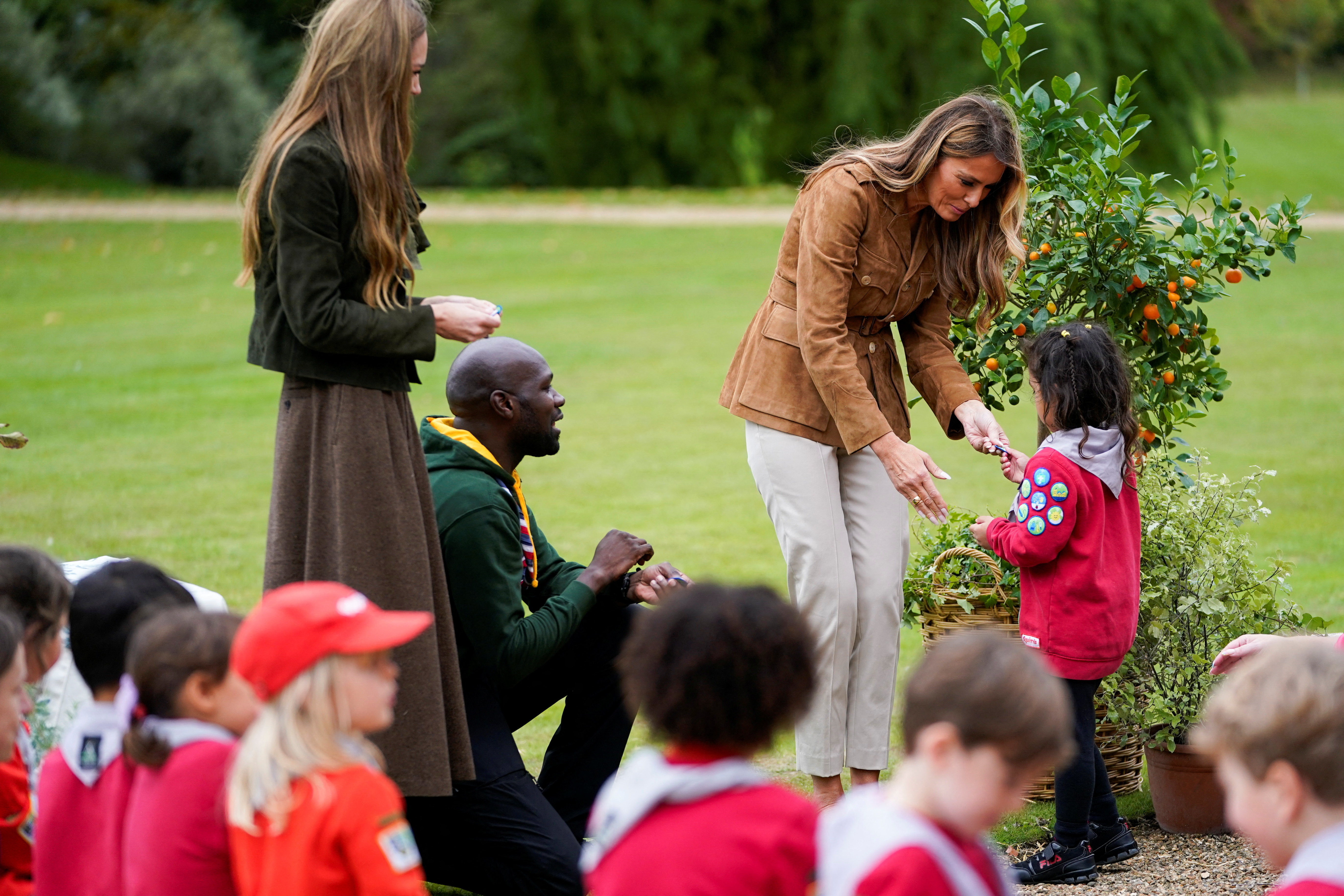 VečMelania se je nato s Kate, soprogo prestolonaslednika Williama, družila s skavti. Obe sta se ob tej priložnosti preoblekli v bolj neformalna oblačila in se z otroki družili na vrtu bližnje podeželske hiše Frogmore Cottage. V njej je pred odhodom v ZDA leta 2020 sicer živel princ Harry s soprogo Meghan.
