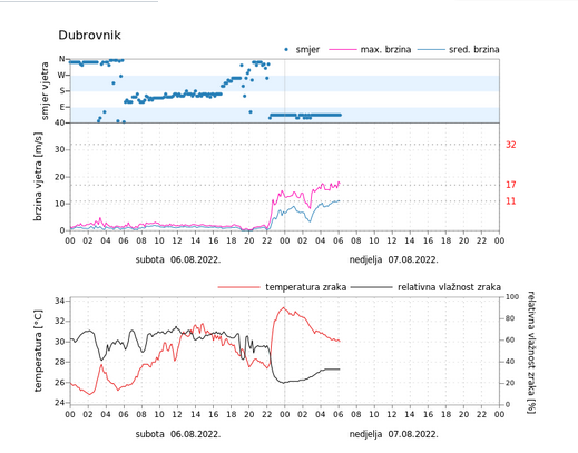 Tudi uradne meritve avtomatske postaje Dubrovnik DHMZ kažejo smer in hitrost vetra ter temperaturo in relativno vlažnost.