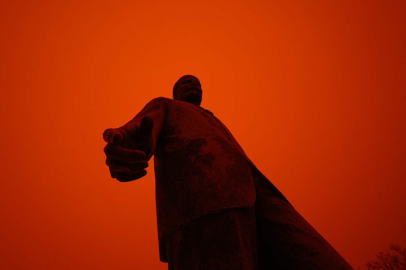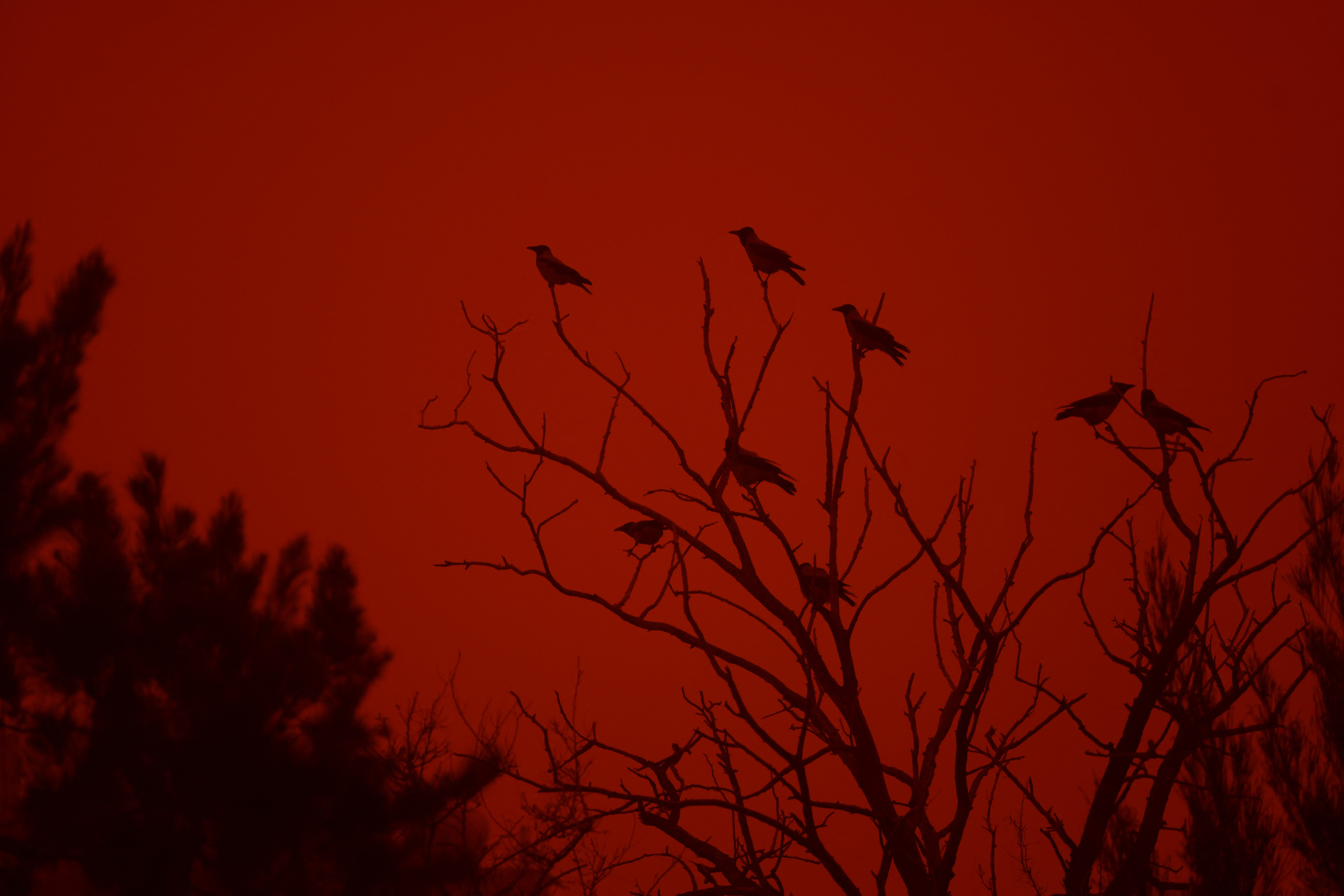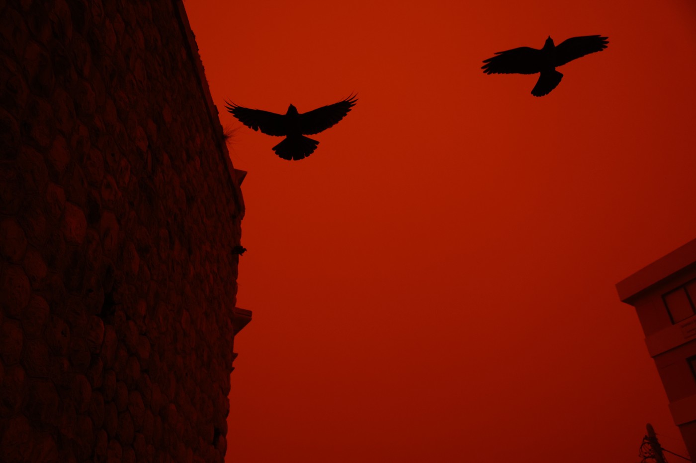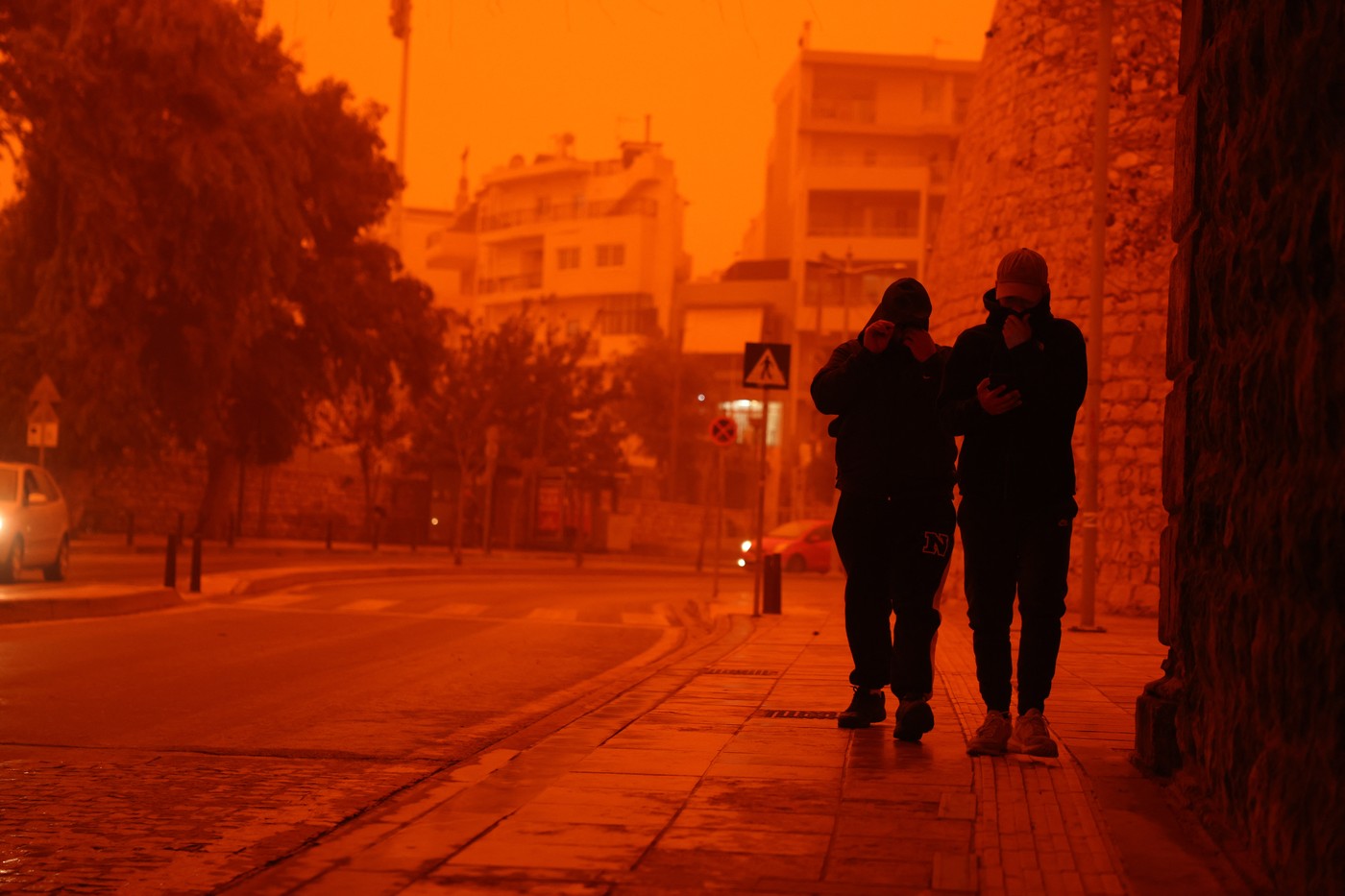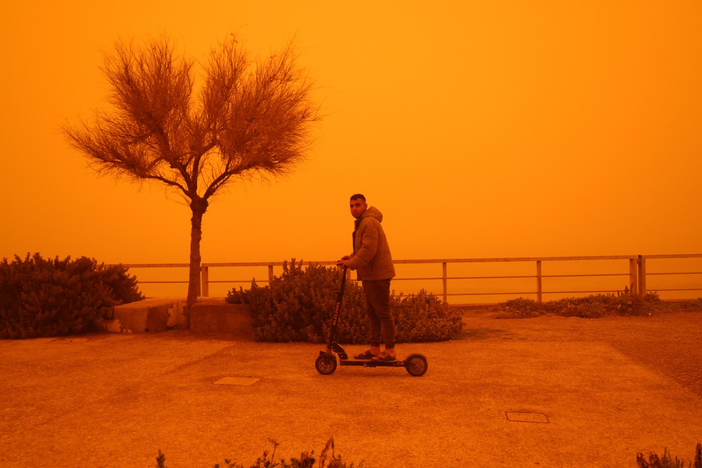 Grški otok Kreta je zajel obsežen oblak saharskega prahu, ki je nebo obarval živo oranžno.