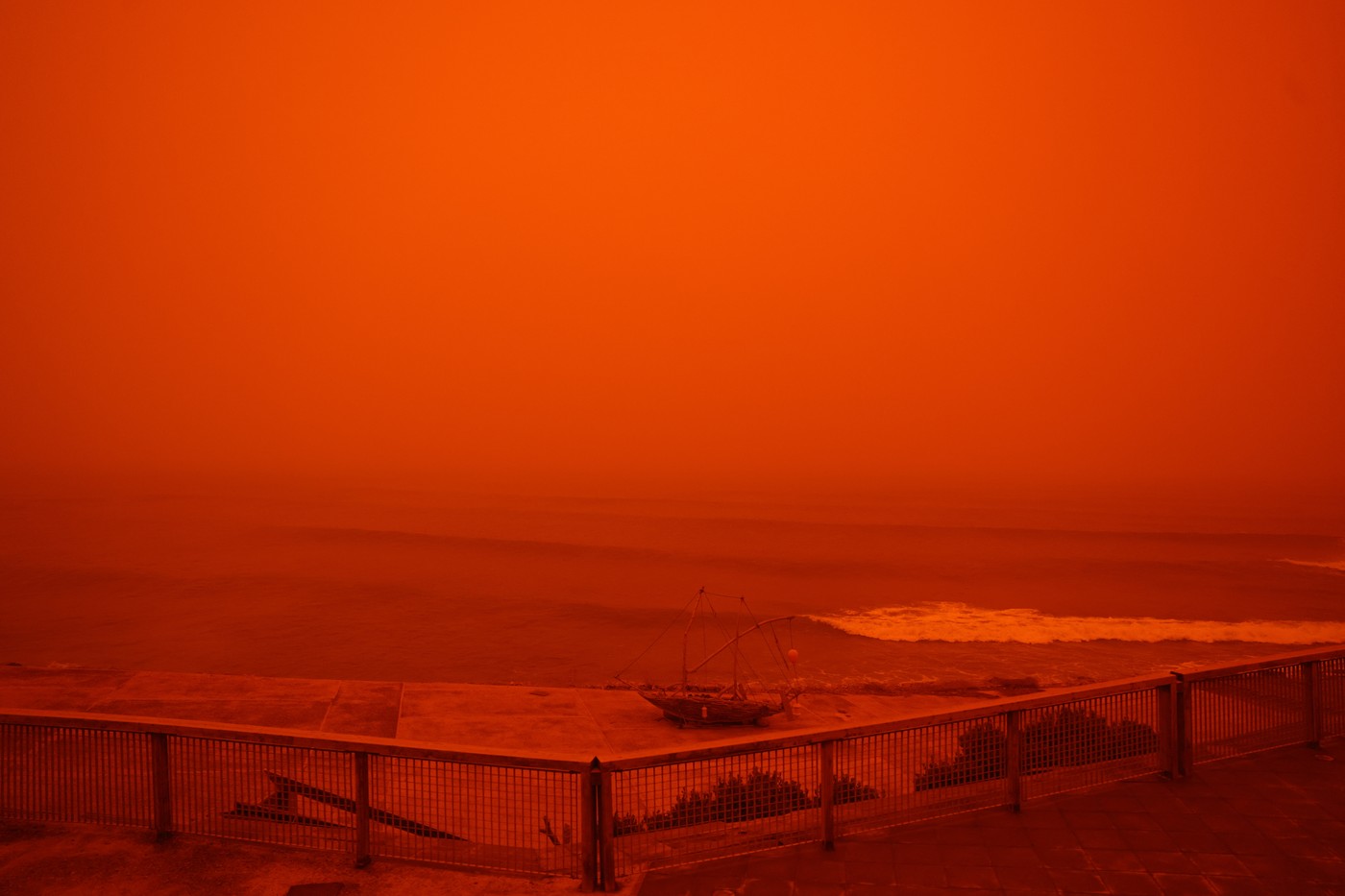 Nebo nad grškim otokom Kreta se je obarvalo živo oranžno, potem ko je otok zajel obsežen oblak saharskega prahu.