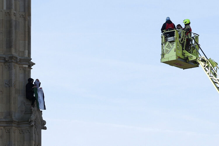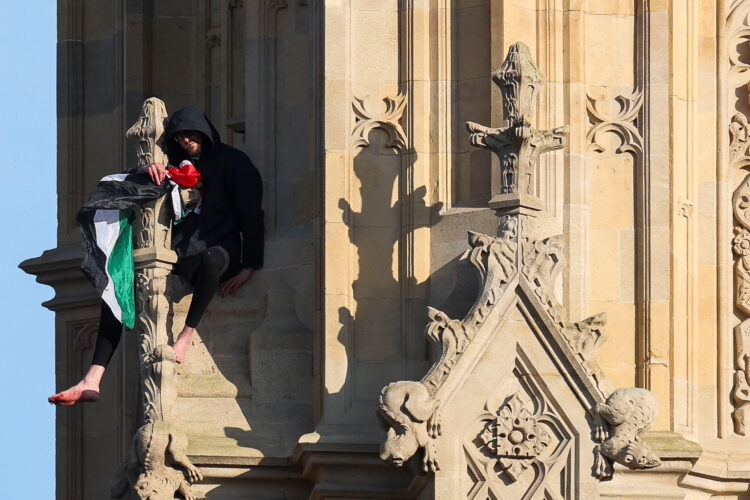 Včeraj ob 7.24 po lokalnem času, kar je 8.24 po našem, je londonska policija dobila poziv, da se je na Elizabetin stolp Big Ben pri Westminstrski palači v središču Londona povzpel bosonogi moški s palestinsko zastavo v roki.