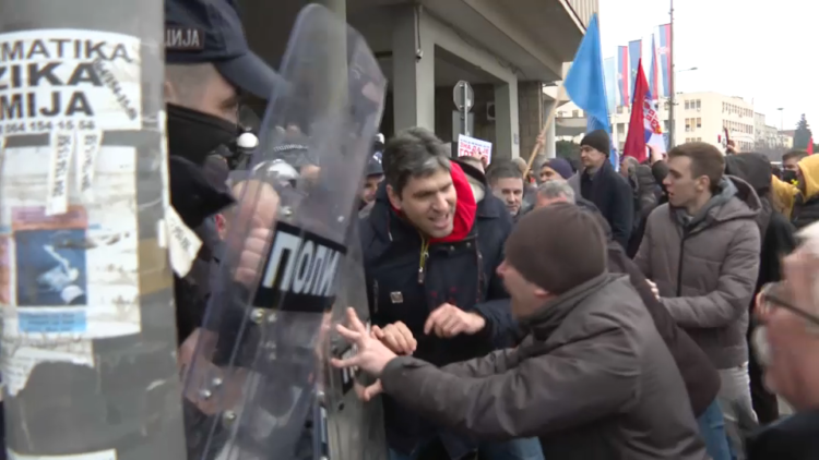 Protestniki so policiste, ki so pred vhodom postavili kordon, obmetavali z jajci, jogurtom, toaletnim papirjem in rdečo barvo, ki je postala simbol protestnikov. Po poročanju N1 Srbije so policisti predmete metali nazaj v protestnike, ob tem pa naj bi v obraz zadeli tudi eno od protestnic, ki so jo prepeljali na urgenco.