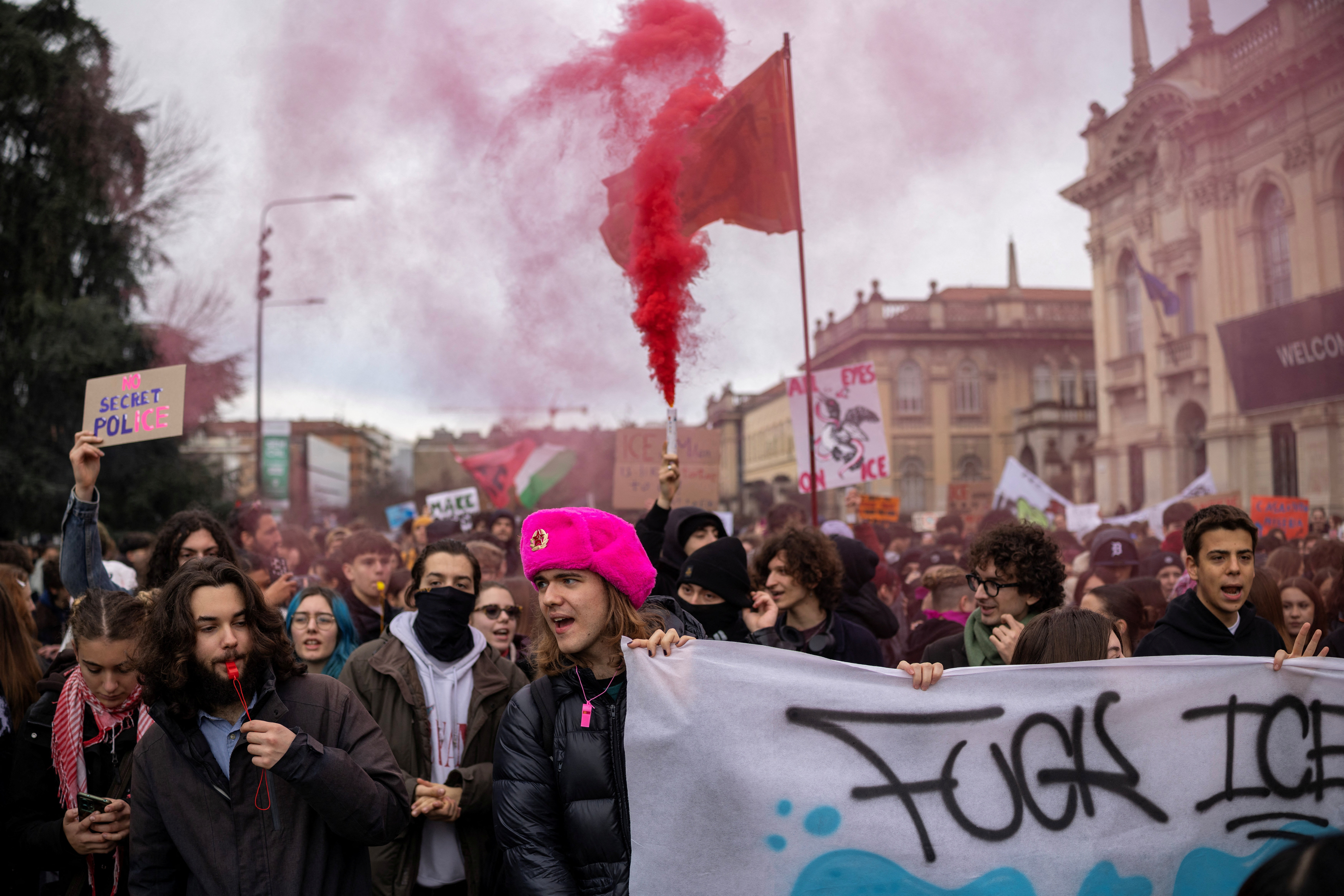 Udeleženci mirnega protesta so med hojo po Milanu nosili transparente z napisi, kot je "Milanu se gnusite", in vzklikali "ICE ven", poroča italijanska tiskovna agencija Ansa.