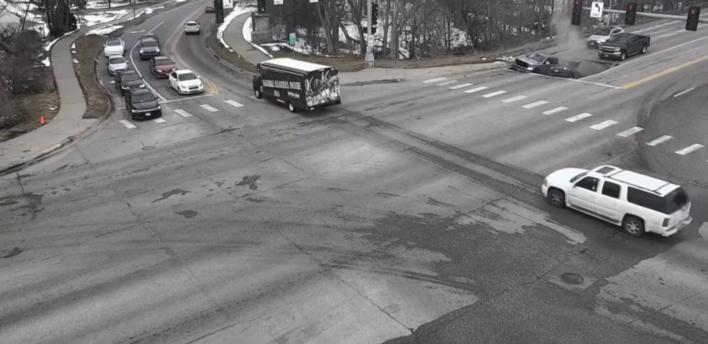 Nadzorne kamere so v mestu Omaha v ameriški zvezni državi Nebraska ujele trenutek, ko so se na cestnem križišču nenadoma udrla tla in pogoltnila dve vozili.