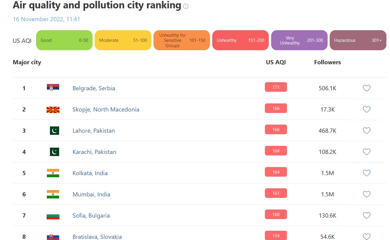 Beograd se je danes dopoldne znašel na prvem mestu seznama najbolj onesnaženih mest na svetu, ki ga pripravlja švicarsko podjetje IQAir. Dosegel je indeks onesnaženosti zraka 171, kar pomeni nevarnost za zdravje. O zelo onesnaženem zraku in visokih vrednostih škodljivih trdih delcev PM10 in PM2,5 vsak dan poročajo tudi iz drugih mest na Balkanu.