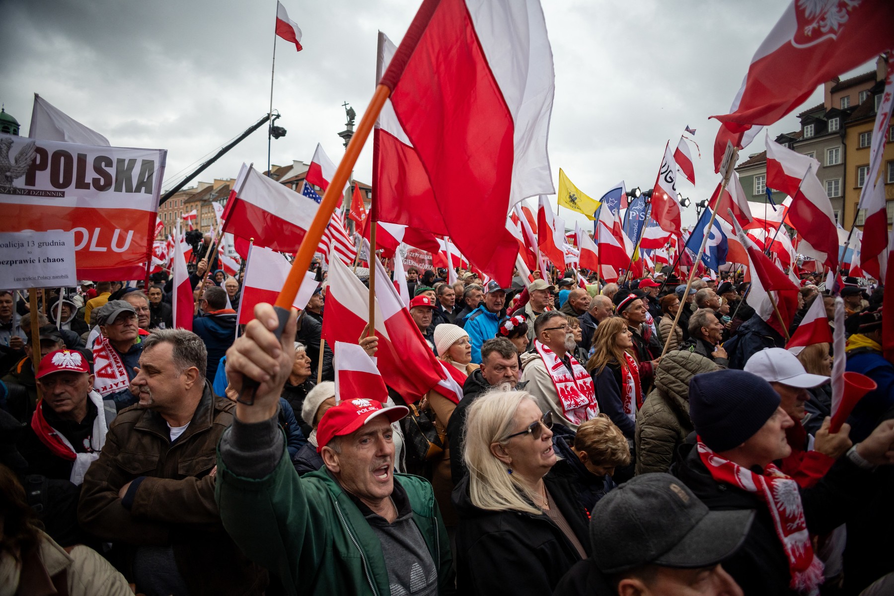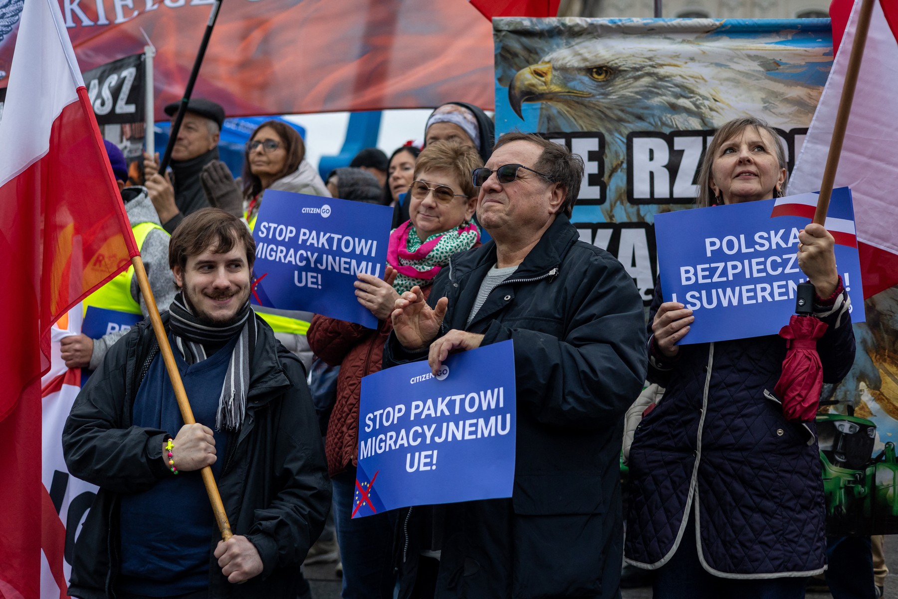 V poljski prestolnici Varšava je potekal protest proti evropski migracijski politiki, h kateremu je pozvala glavna opozicijska stranka Zakon in pravičnost (PiS), ki podpira nacionalističnega predsednika Karola Nawrockega.