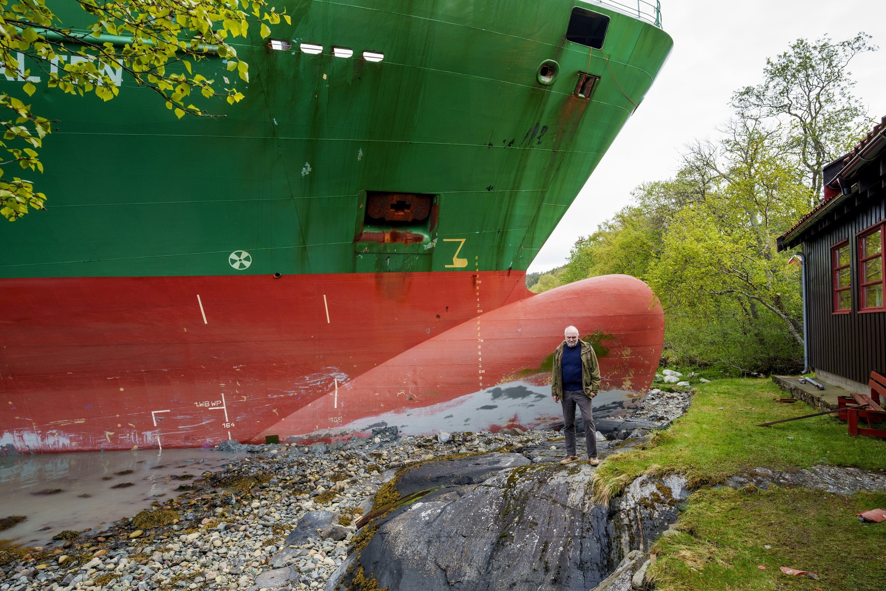 Zgodba o Norvežanu Johanu Helbergu, ki se je minuli četrtek nič hudega sluteč zbudil, nato pa je le nekaj metrov stran od svoje hiše zagledal 135 metrov dolgo tovorno ladjo, je zakrožila po družbenih omrežjih.