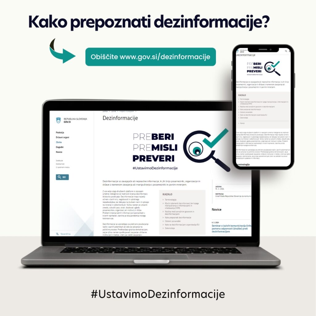 Zavedanje o dezinformacijah in tem, da smo lahko njihova tarča, je prvi korak k zaščiti. V ta namen je bila na GOV.SI vzpostavljena tematska podstran o dezinformacijah, kjer najdete kopico poglobljenih vsebin in novic o vrstah dezinformacij, njihovem prepoznavanju in načinih preprečevanja. Obenem je v teku tudi državna kampanja Ustavimo dezinformacije – preBERI, preMISLI, PREVERI, katere namen je širjenje ozaveščenosti o dezinformacijah, njihovem prepoznavanju in ločevanju od kakovostnih, kredibilnih informacij.