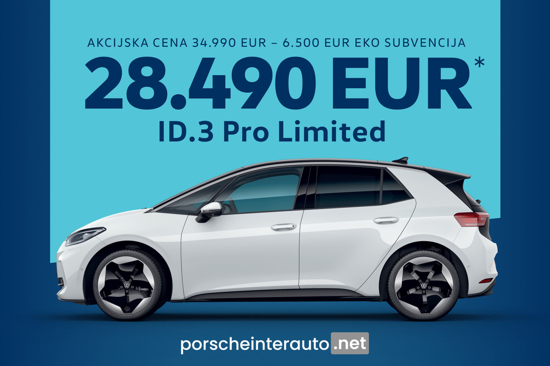 Ste pripravljeni na električno prihodnost mobilnosti? Popolnoma novi VW ID.3 Pro Limited zagotavlja vrhunsko serijsko opremo po ugodnejši ceni. Pri Porsche Inter Auto je Volkswagen ID.3. Pro Limited lahko vaš že za 27.490 €* v primeru sklenitve financiranja in zavarovanja pod pogoji VW ID BON* (-1.000 €*) ter pridobitve nepovratne finančne spodbude EKO Sklada v vrednosti 6.500 €.* Ponudba velja za omejeno količino vozil. Izkoristite edinstveno ponudbo v Sloveniji!