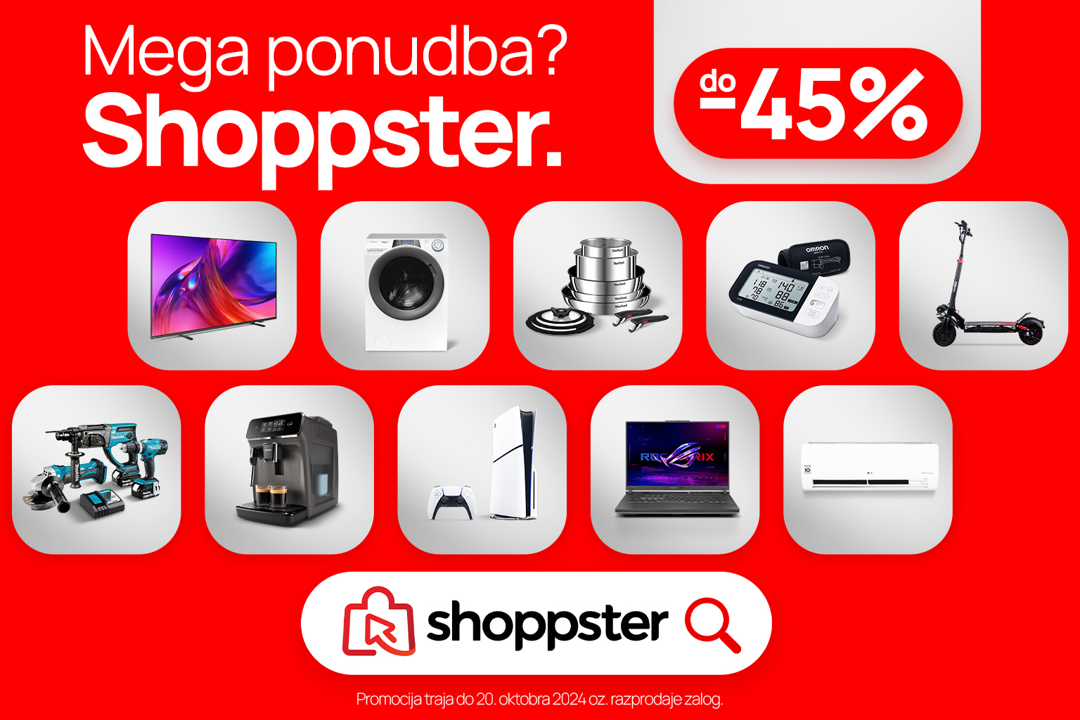 Kdo ne želi prihraniti časa, energije IN denarja? Shoppster je za ugodno in udobno nakupovanje pripravil Mega ponudbo, kjer najdete belo tehniko, male gospodinjske aparate, računalništvo, TV, avdio, video in foto, vse za lepoto in zdravje, vse za dom, orodje, vse za otroke in tudi za male živali – in vse to na enem mestu. Privoščite si kavico doma ali v mestnem središču, stran od nakupovalne gneče, ter v miru in počasi nakupujte s pomočjo pametnega telefona, tabličnega ali prenosnega računalnika. Zdaj je prava priložnost, da odkrijete Mega ponudbo in prihranite do 45 %! Pohitite, promocija traja le do 20. oktobra!