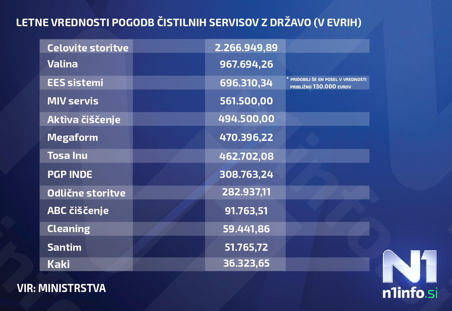 Med pogodbenimi izvajalci, ki imajo pogodbe največjih vrednosti z državo, so tako Celovite storitve, Valina, EES sistemi, MIV servis, Aktiva čiščenje, Megaform, Tosa Inu, … Z inšpektorata za delo so nam sporočili, da so pri vseh omenjenih večjih pogdbenih izvajalcih v preteklosti izvedli nadzore ali pa ti pravkar potekajo. Podjetji, pri katerih so bili v zadnjih treh letih izvedeni nadzori in ugotovljene nepravilnosti, sta Megaform in Celovite storitve, v preteklosti pa so inšpektorji ugotovili kršitve tudi v podjetjih EES sistemi in Valina.