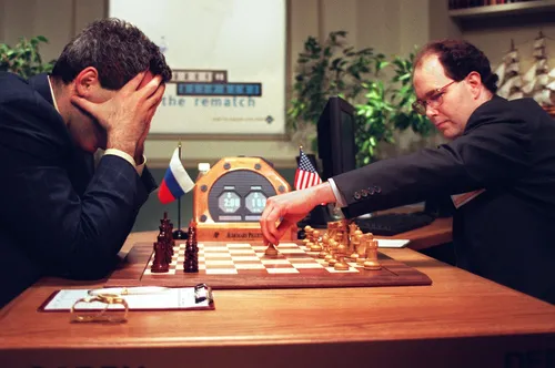 Eden od prelomnih dosežkov umetne inteligence se je zgodil leta 1997, ko je aktualnega svetovnega šahovskega prvaka in velemojstra Garija Kasparova premagal IBM računalniški program za igranje šaha Deep Blue. Ta zelo odmevna tekma je pomenila velik korak v razvoju umetne inteligence. Na zgornji sliki sta Kasparov, ki se drži za glavo, in znanstvenik IBM, ki v imenu računalnika premika figure.