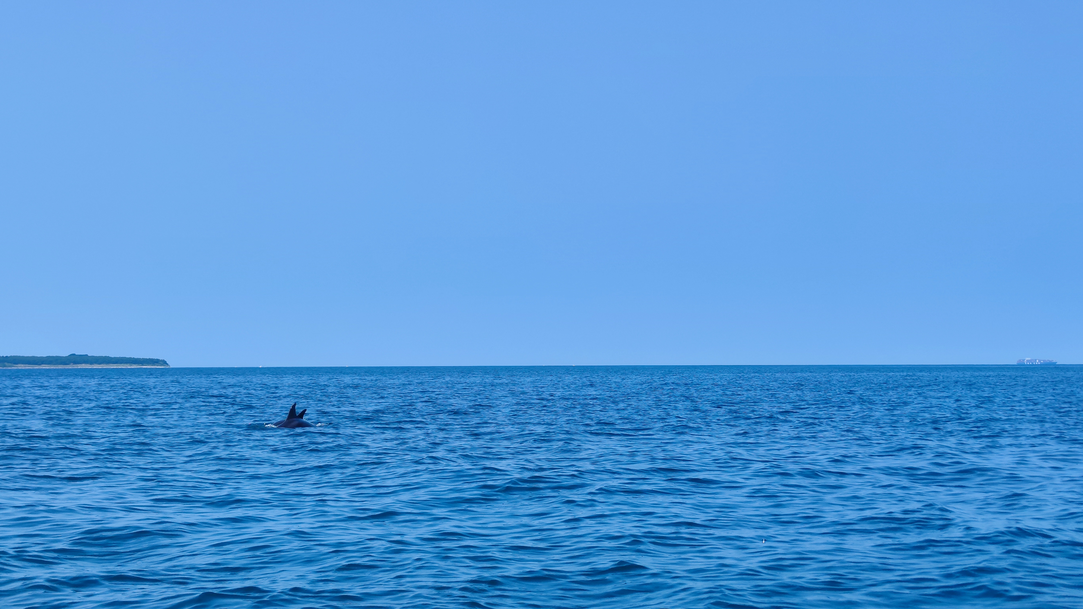 Ne traja dolgo, ko projektni vodja društva Krista Lokar obstane in s prstom pokaže v smeri plovbe. In res, kmalu zagledamo prvega delfina. Nato pa še dva, tri ...